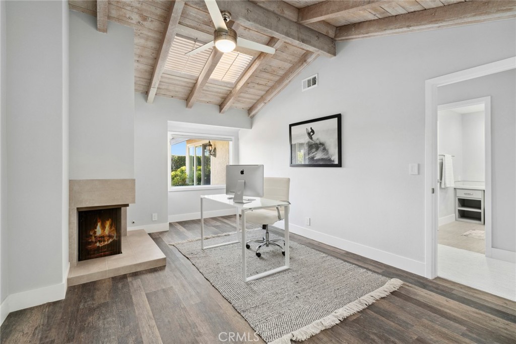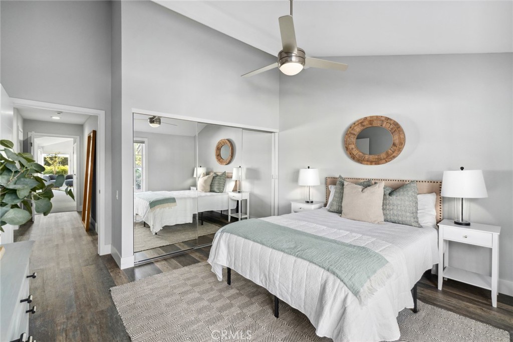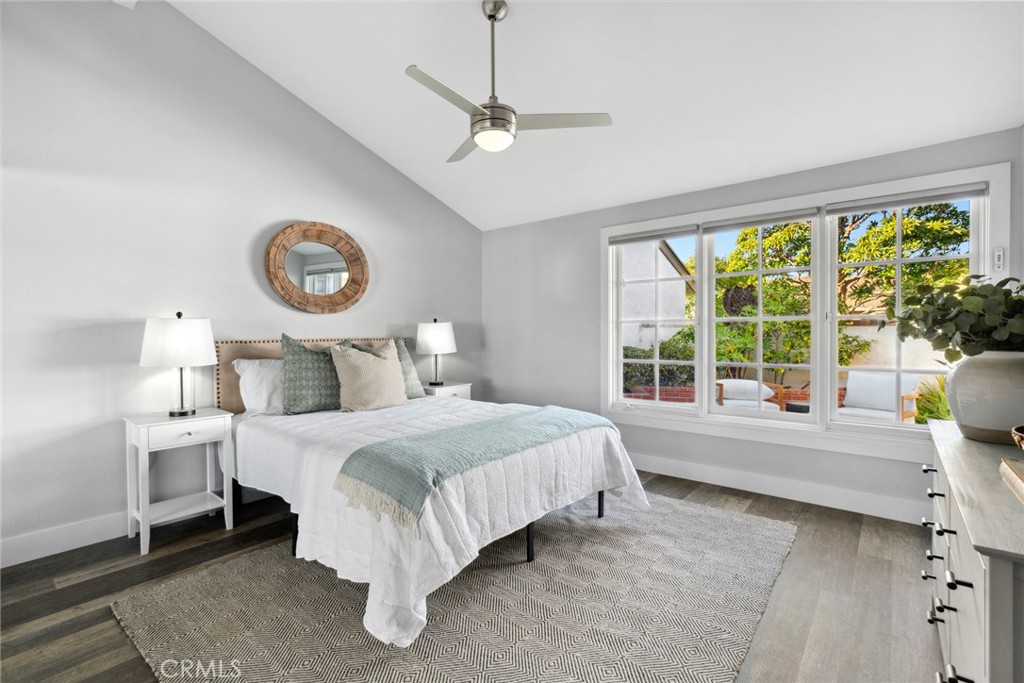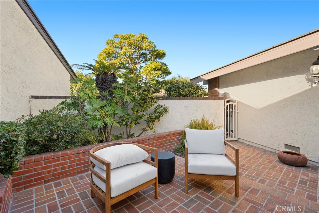 The functional layout places the two bedrooms on opposite sides of the home, while the master suite includes a walk-in closet and private outdoor access. The upscale kitchen offers a breakfast bar, and informal dining area, overlooking the cute front patio. The incredibly spacious back patio, surrounded by landscaping, presents ample potential for creating outdoor entertaining spaces, ideal for enjoying the coveted coastal lifestyle.