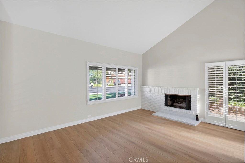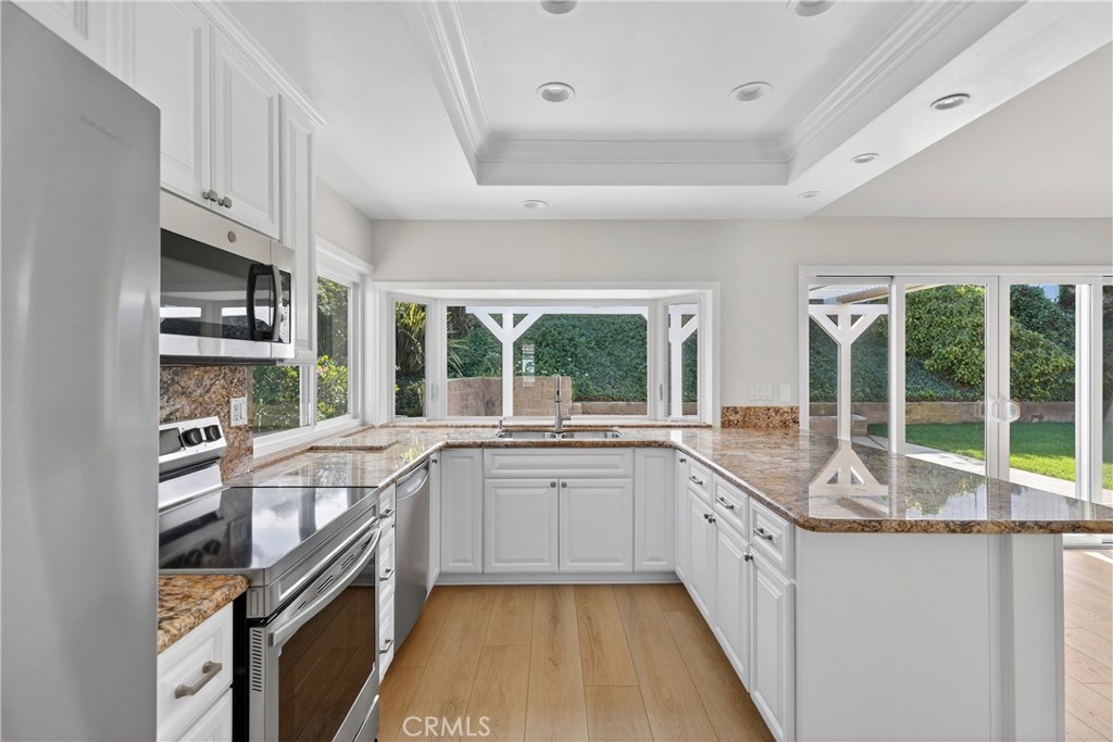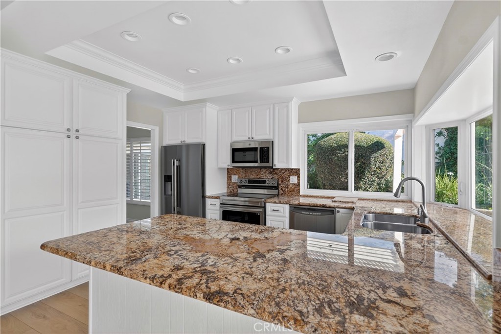 The upgraded kitchen features granite countertops, recessed lighting, and stainless steel appliances, all with serene views of the backyard. The outdoor space wraps around to the front of the home, creating a natural flow to the separate yet connected living and dining rooms, highlighted by a cozy fireplace.