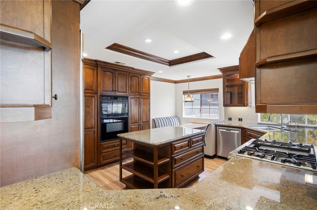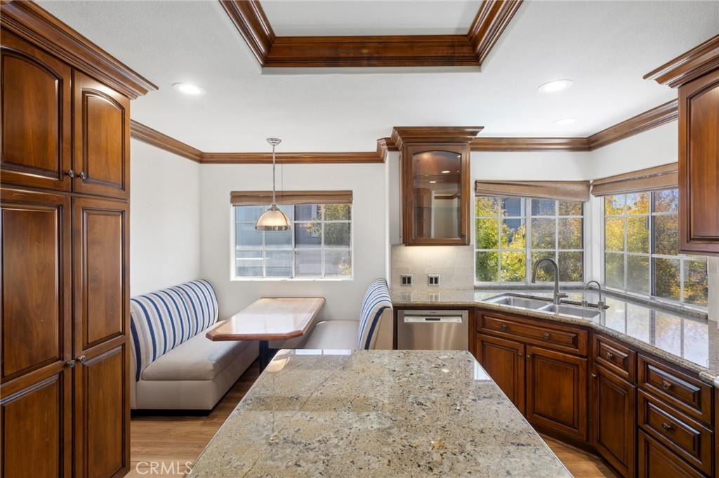 One of the most exquisitely reimagined residences to grace the coveted "55 and better" Terraces, all single level, with no steps in the home, and ideally situated in the heart of Corona del Mar. This sophisticated two-bedroom, two-bath home with a dedicated office has been thoughtfully curated with elevated finishes throughout--every detail meticulously completed for effortless living. The gourmet kitchen is a statement of timeless elegance, featuring custom cabinetry, granite countertops, a charming built-in breakfast nook, integrated refrigerator, and a bespoke range hood. A beautifully opened pass-through seamlessly connects the kitchen to the living space, enhancing both flow and natural light while creating an inviting, open-concept ambiance. Underfoot, luxury linoleum flooring extends throughout, complemented by refined baseboards and crown molding. Both bathrooms have been impeccably redesigned with elevated custom vanities, stone surfaces, and sleek frameless walk-in showers, evoking a spa-like experience. Our Primary enjoys a full walk-in closet. The secondary suite has been thoughtfully enhanced with the addition of a private door, creating a true ensuite retreat and offering exceptional privacy for guests. This room also features a built-in Murphy bed for room use flexibility. Additional highlights include an attached laundry area with newer LG washer and dryer, as well as an epoxied garage floor--just a few of the many upgrades that define this elegant home. Enjoy enchanting views in the distance of the ocean and Catalina Island, along with shimmering city lights and breathtaking sunsets. The Terraces boasts a sparkling ocean-view pool and spa, along with charming Clubhouse and other amenities. Ideally located adjacent to the Oasis Senior Center and just moments from all that Corona del Mar has to offer--beautiful beaches, world-class dining, chic boutiques, and upscale markets--this residence embodies refined coastal living at its finest.